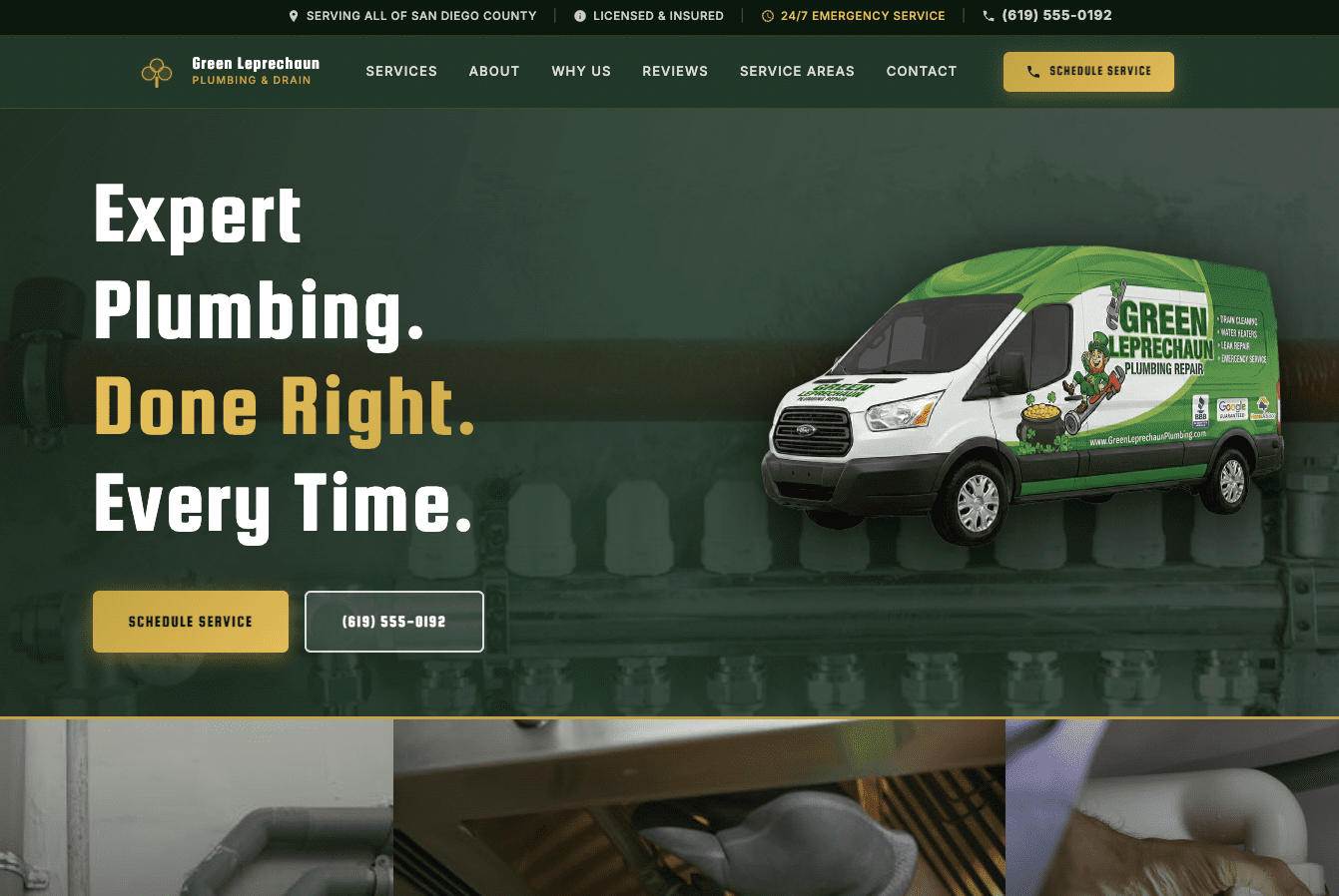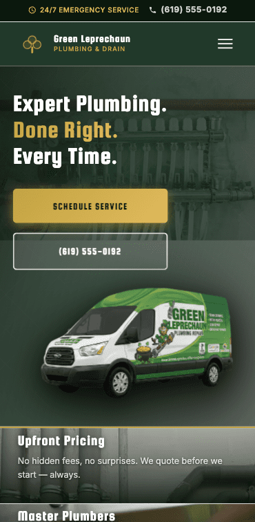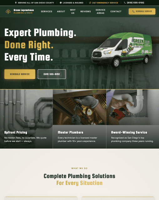 Green Leprechaun Plumbing serves the San Diego area with licensed, insured plumbing around the clock — but their brand had something most plumbing companies don’t: a name with personality. The challenge was building a website that honored that identity while competing seriously for emergency and long-term service customers in a crowded market. The site needed to work at 2 AM when someone’s basement is flooding just as well as it works on a Tuesday afternoon when someone’s planning a water heater replacement.