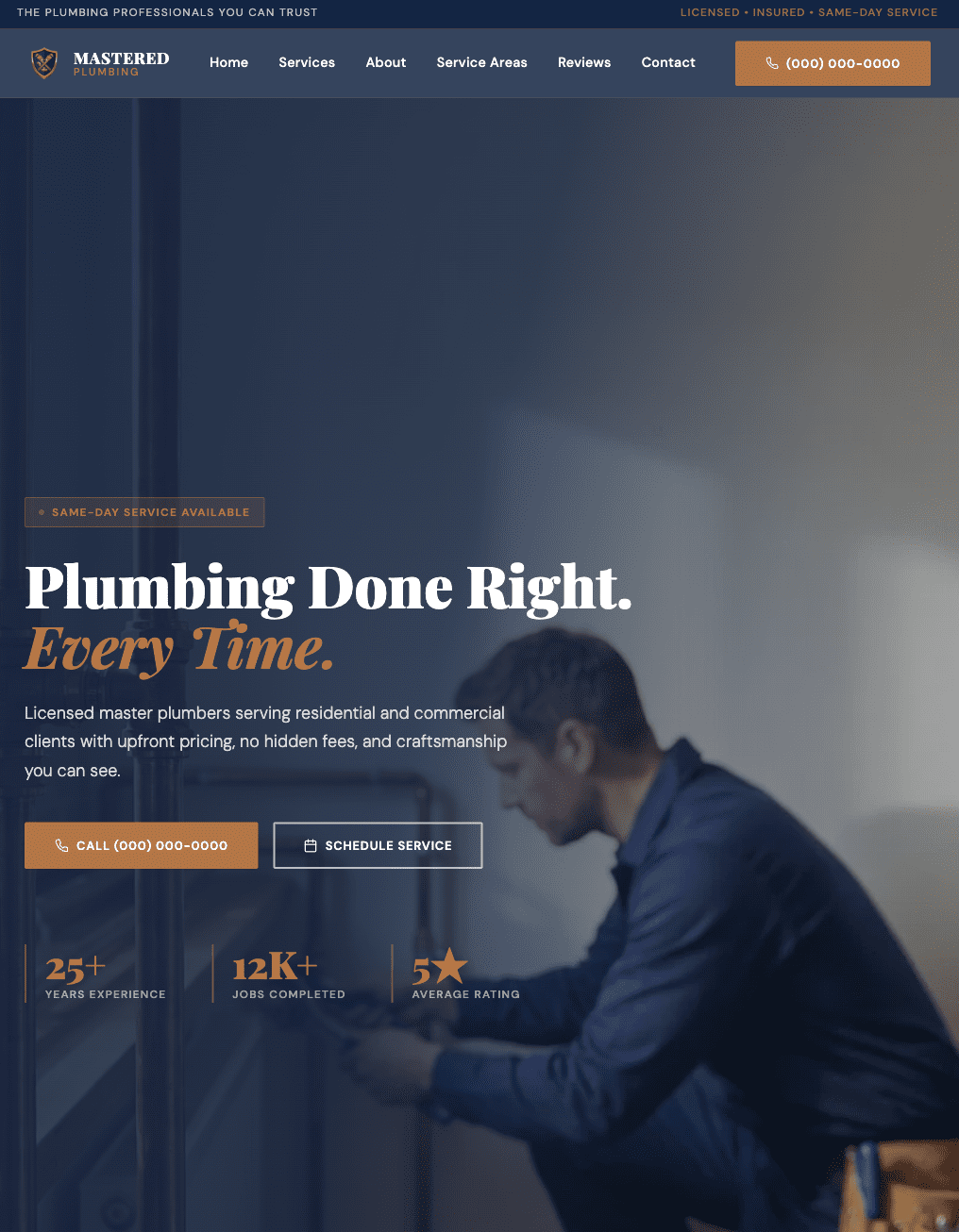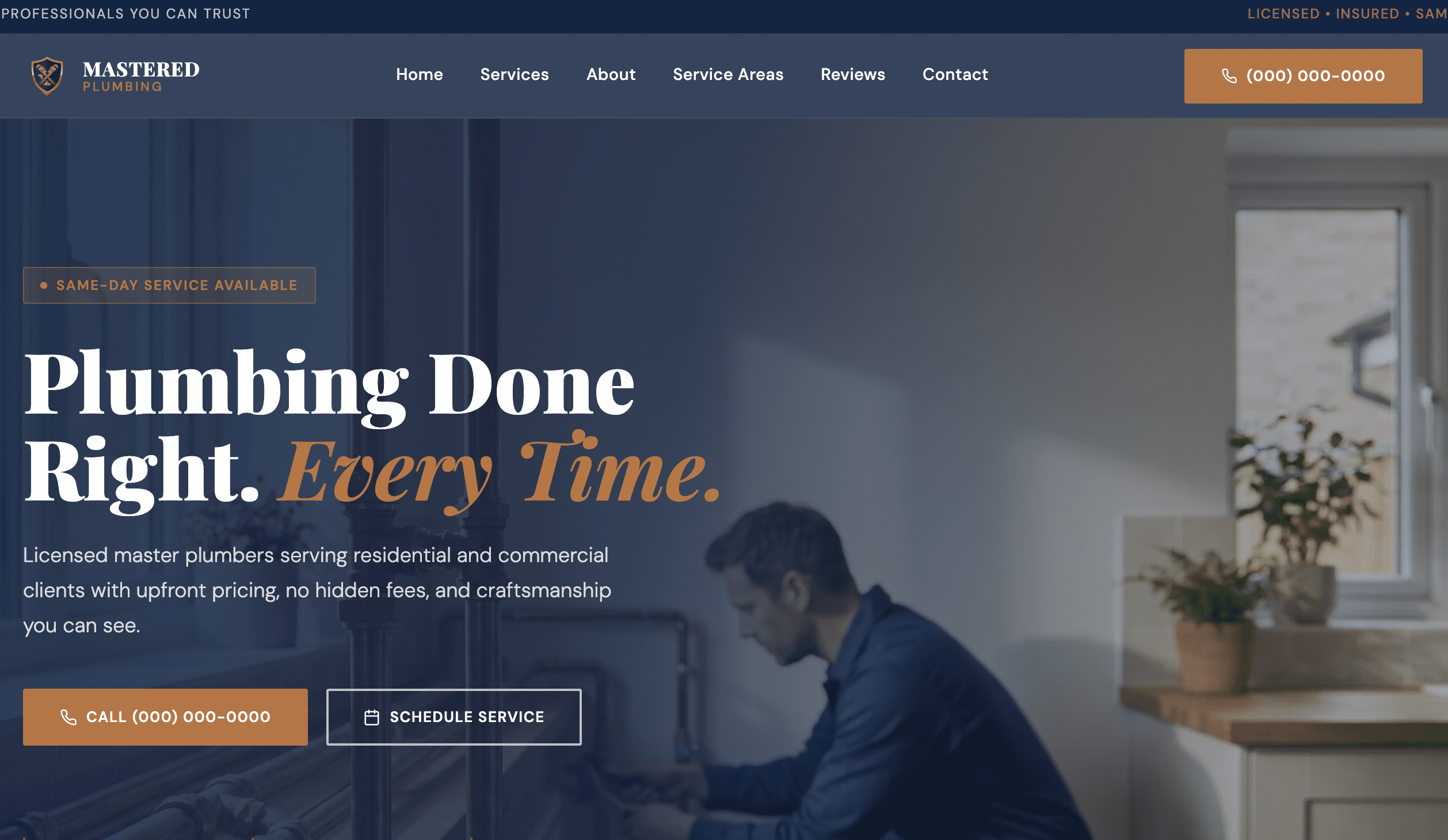Mastered Plumbing brings over 25 years of licensed master plumbing experience and hundreds of completed jobs to the DFW market. The challenge was building a website that matched that level of credibility — one that immediately communicated professionalism and trust to a homeowner in the stressful moment of searching for a plumber. Most plumbing sites look like they were built in 2009. This one needed to feel different.