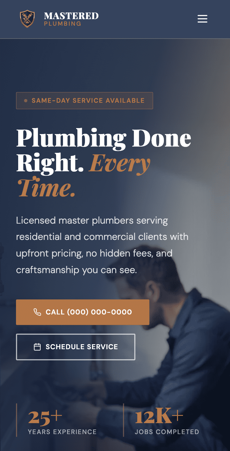 We developed a premium industrial aesthetic built around a navy and copper color palette — a combination that signals expertise, reliability, and quality without feeling cold or corporate. Bold serif headings establish authority instantly, while the copper accent color drives the eye to every call-to-action. Trust badges — “Licensed & Insured,” “Same-Day Service Available,” “Upfront Pricing, No Hidden Fees” — are front and center because in the plumbing industry, trust is the conversion lever.