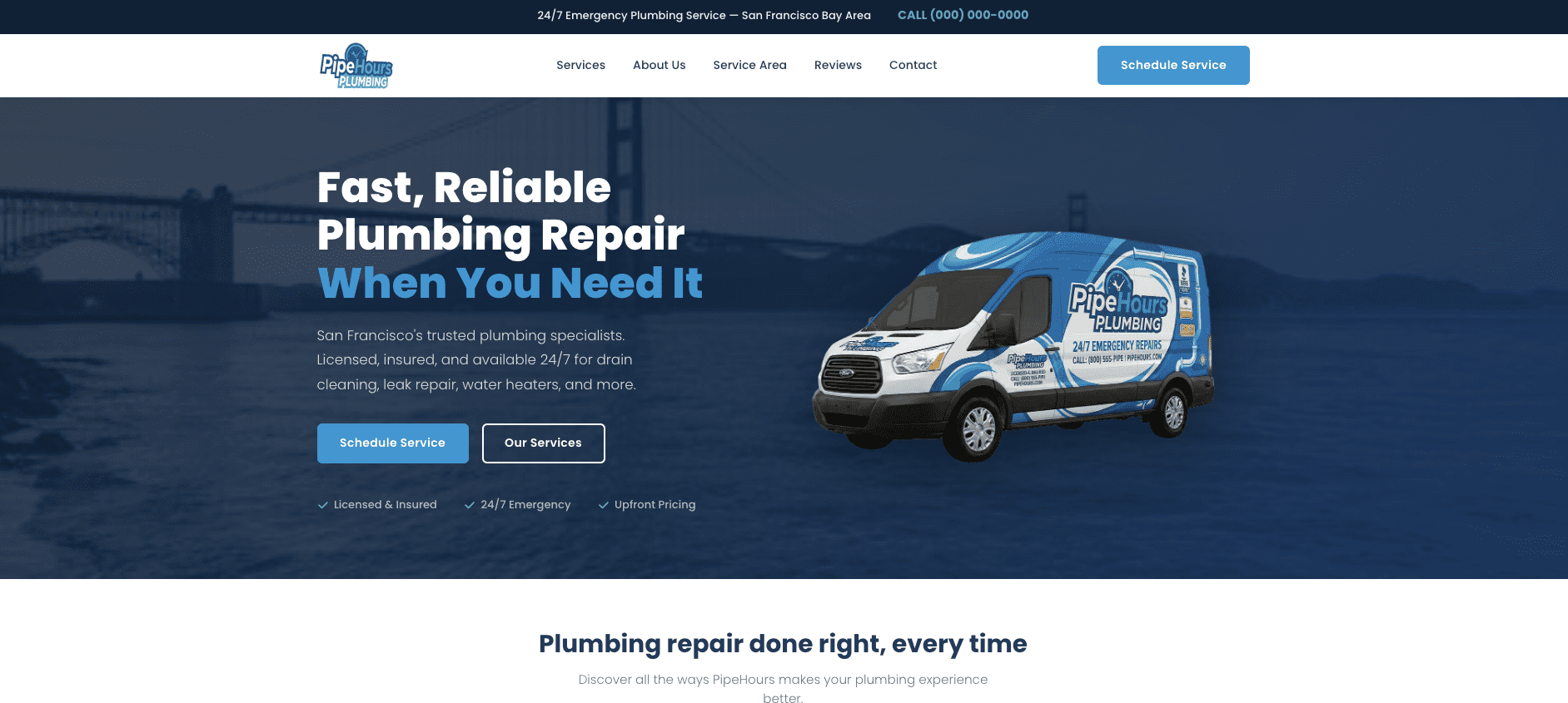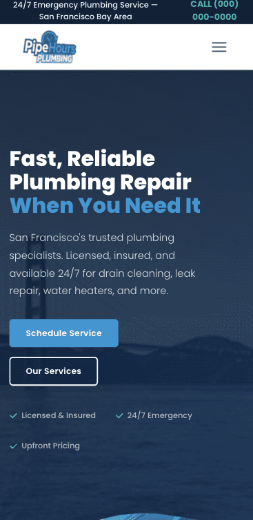 PipeHours Plumbing serves the San Francisco Bay Area with 24/7 licensed and insured plumbing — a market where trust is everything and competition for emergency search queries is fierce. The challenge was building a site that communicated authority instantly to a stressed homeowner comparing Google results at midnight, while also earning the long-term customer who’s taking their time to find the right team.